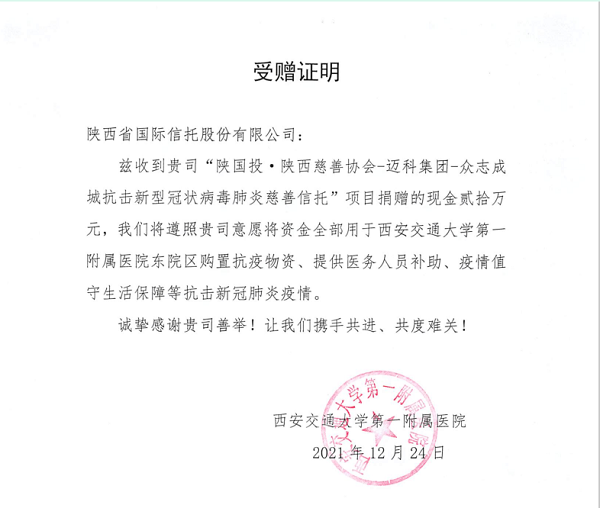 在全市封閉式管理第一天,陜國投當(dāng)天就完成“陜國投·陜西慈善協(xié)會-邁科集團-眾志成城抗擊新型冠狀病毒肺炎慈善信托”向西安市雁塔區(qū)慈善協(xié)會的首批50萬元資金捐贈,為雁塔區(qū)進行核酸檢測的醫(yī)護人員提供補助。12月24日,該信托向西安交通大學(xué)第一附屬醫(yī)院捐贈20萬元,該筆資金緩解了醫(yī)護人員面臨的物資短缺問題,給寒冬中堅守抗疫的醫(yī)護人員帶去溫暖。