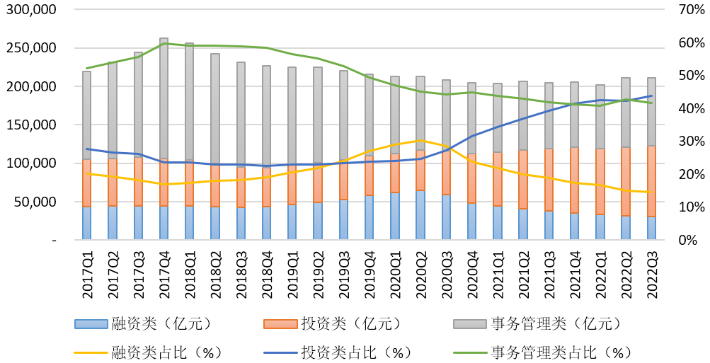 三是信托資產(chǎn)功能結(jié)構(gòu)發(fā)生深刻變化。自2018年資管新規(guī)出臺(tái)以來,行業(yè)投資類信托業(yè)務(wù)發(fā)展明顯加快,規(guī)模持續(xù)快速增長,2022年3季度末規(guī)模為9.22萬億元,同比增長14.77%,環(huán)比增長3.13%;較2021年末規(guī)模增長0.72萬億元,增長8.44%;占比為43.75%,同比上升4.46個(gè)百分點(diǎn),環(huán)比上升1.40個(gè)百分點(diǎn),今年以來連續(xù)3季度保持在信托資產(chǎn)功能分類的首位。融資類信托規(guī)模在監(jiān)管要求和風(fēng)險(xiǎn)防控壓力下,自2020年2季度以后持續(xù)下降,2022年3季度末規(guī)模為3.08萬億元,同比大幅下降20.31%,環(huán)比下降2.80%,較2021年末規(guī)模下降0.51萬億元,降幅14.11%,占比為14.59%,同比下降4.29個(gè)百分點(diǎn),環(huán)比下降0.40個(gè)百分點(diǎn)。事務(wù)管理類信托2017年末達(dá)到峰值后,在壓降通道政策引導(dǎo)下持續(xù)回落,2022年開始隨著信托在風(fēng)險(xiǎn)隔離、風(fēng)險(xiǎn)處置、財(cái)富傳承等領(lǐng)域功能的不斷認(rèn)識(shí)和探索,規(guī)模企穩(wěn)回升。事務(wù)管理類信托3季度末規(guī)模為8.78萬億元,同比增長2.65%,環(huán)比下降2.52%,較2021年末規(guī)模增長0.31萬億元,增長3.69%,占比為41.65%,同比微降0.17個(gè)百分點(diǎn),環(huán)比下降1個(gè)百分點(diǎn)。