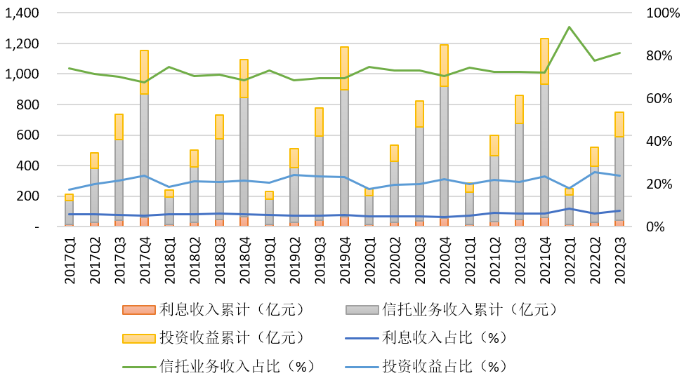 截至2022年3季度末,行業(yè)信托業(yè)務(wù)收入在經(jīng)營收入中的占比上升到81.32%,同比提升8.87個(gè)百分點(diǎn)。從2022年前三季度總體情況看,信托業(yè)務(wù)收入占比分別達(dá)到93.43%、77.78%、81.32%,均高于過去歷年同期的水平,信托主業(yè)地位日益鞏固。